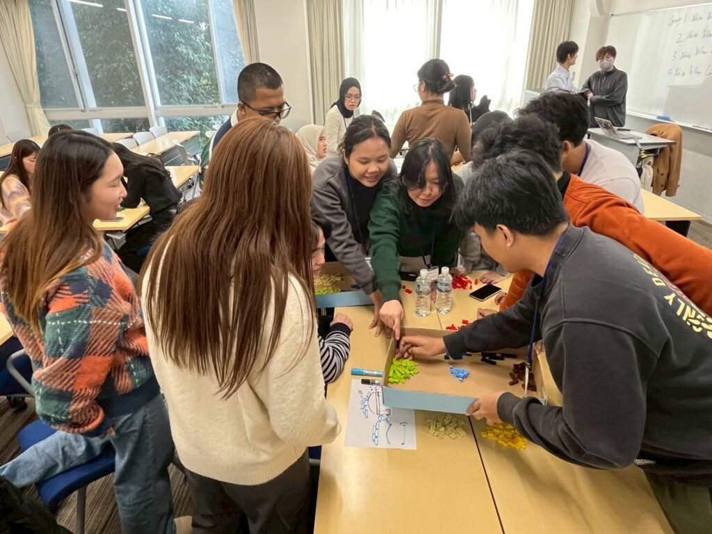 In contrast to the discussions held the previous day, students participated in activities on this day designed to foster community building and multicultural collaborative learning. During the morning session, students took part in the LEGO Challenge, an intercultural activity in which they discussed ideas across cultures and worked creatively to build a sturdy 40-centimeter bridge using LEGO blocks. In the afternoon, students engaged in tandem learning (language exchange), teaching each other their own languages and sharing aspects of their cultures. For the Indonesian students, this provided a valuable opportunity to learn practical Japanese that would be useful in their daily lives.